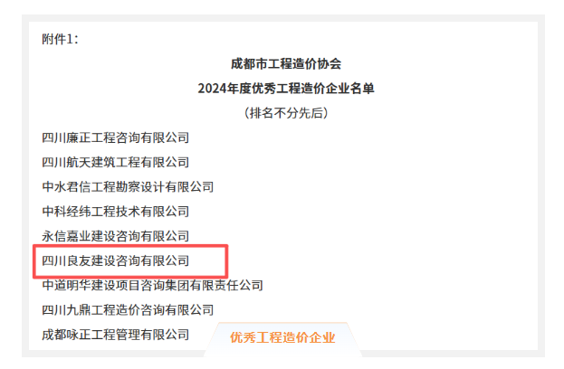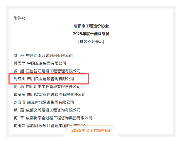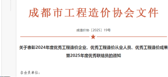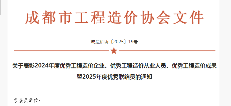 近日,成都市工程造價協(xié)會發(fā)布了《關于表彰2024年度優(yōu)秀工程造價企業(yè)、優(yōu)秀工程造價從業(yè)人員、優(yōu)秀工程造價成果暨2025年度優(yōu)秀聯(lián)絡員的通知》,我司憑借專業(yè)實力與突出貢獻,斬獲多項殊榮。
